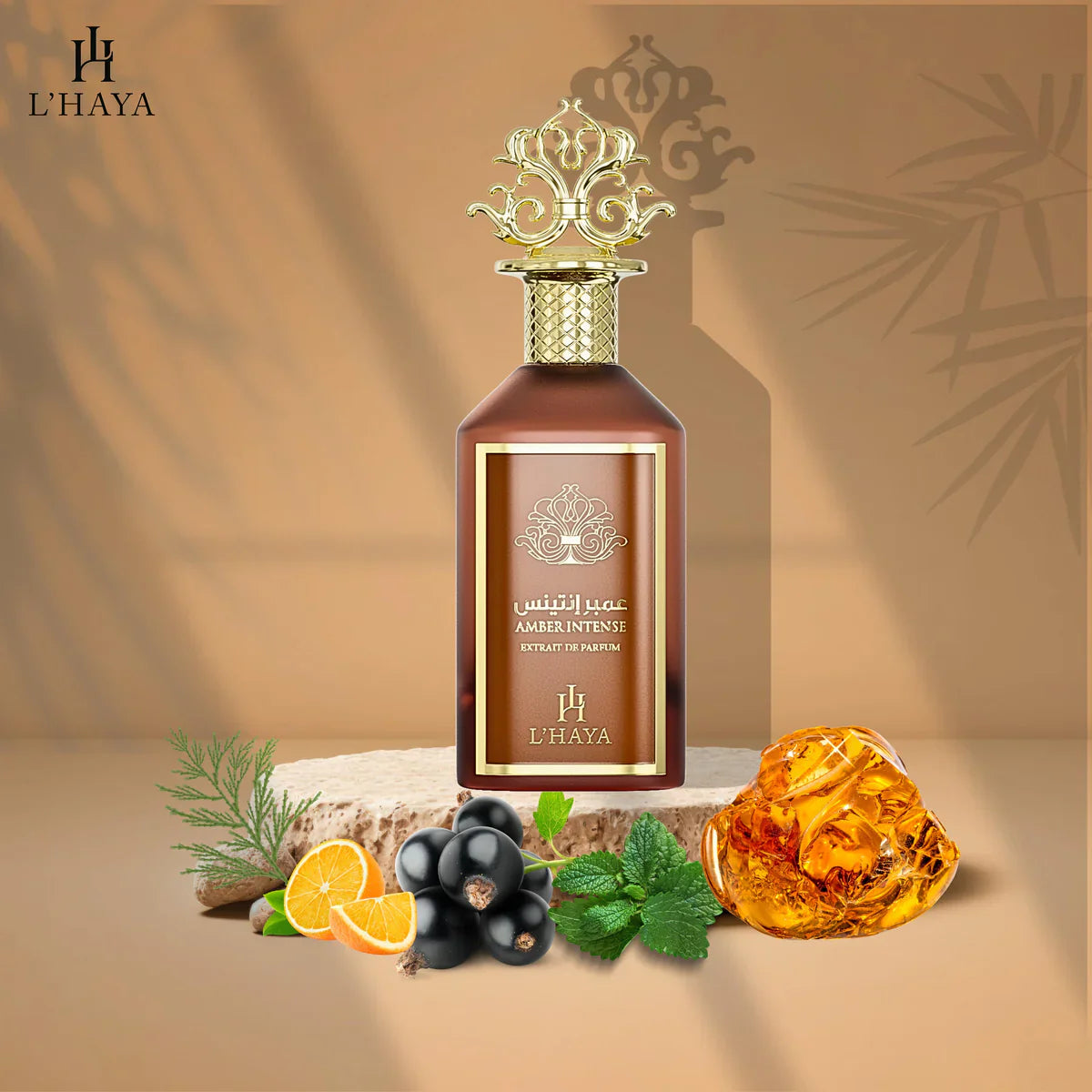 L’Haya Amber Intense Extrait de Parfum is a unisex fragrance that blends fresh, spicy, and woody notes, providing a sophisticated and enveloping olfactory experience.